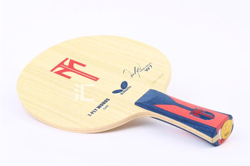 相比于纤维板的创新不止,蝴蝶的纯木系列遵循的是以不变应万变。W7 属于波尔旗舰系列中的新式武器,骨子里却是典型的传统硬七夹。厚度 7.0mm,重量绝少低于 90g,100 克以上的偶尔也可以看见,结构是双面寇头加五层阿尤斯,整体硬度和老 CL 有一拼,形变极小,速度超快,除了速度还是速度。如果迷恋传统硬七夹,试试 W7,相信会有经典重现的感觉。